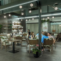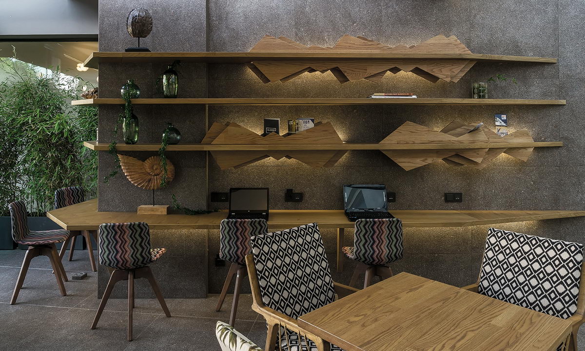 The Waves Eco Bar Restaurant concept is based on the principles of ecology, sustainability and conservation. In the architectural design, some previous elements were kept, such as the stone waterfall depicting a Greek village. Every effort was made to keep all construction materials with a low environmental footprint, such as upcycled and recyclable products. The wooden covering of the bar consists of upcycled old building wooden materials. The ceiling flora are natural dehydrated flowers. The bookstands and the large dining table are specially designed for bleisure activities, made in solid oak. An aromatic garden of 17 different herbs was created for customers' pleasure. The kitchen makes daily use of the herbs, to give a feeling of garden to table sense. The menu contains vegan and raw food selections. Drinks and potions use fresh ingredients of protected origin.