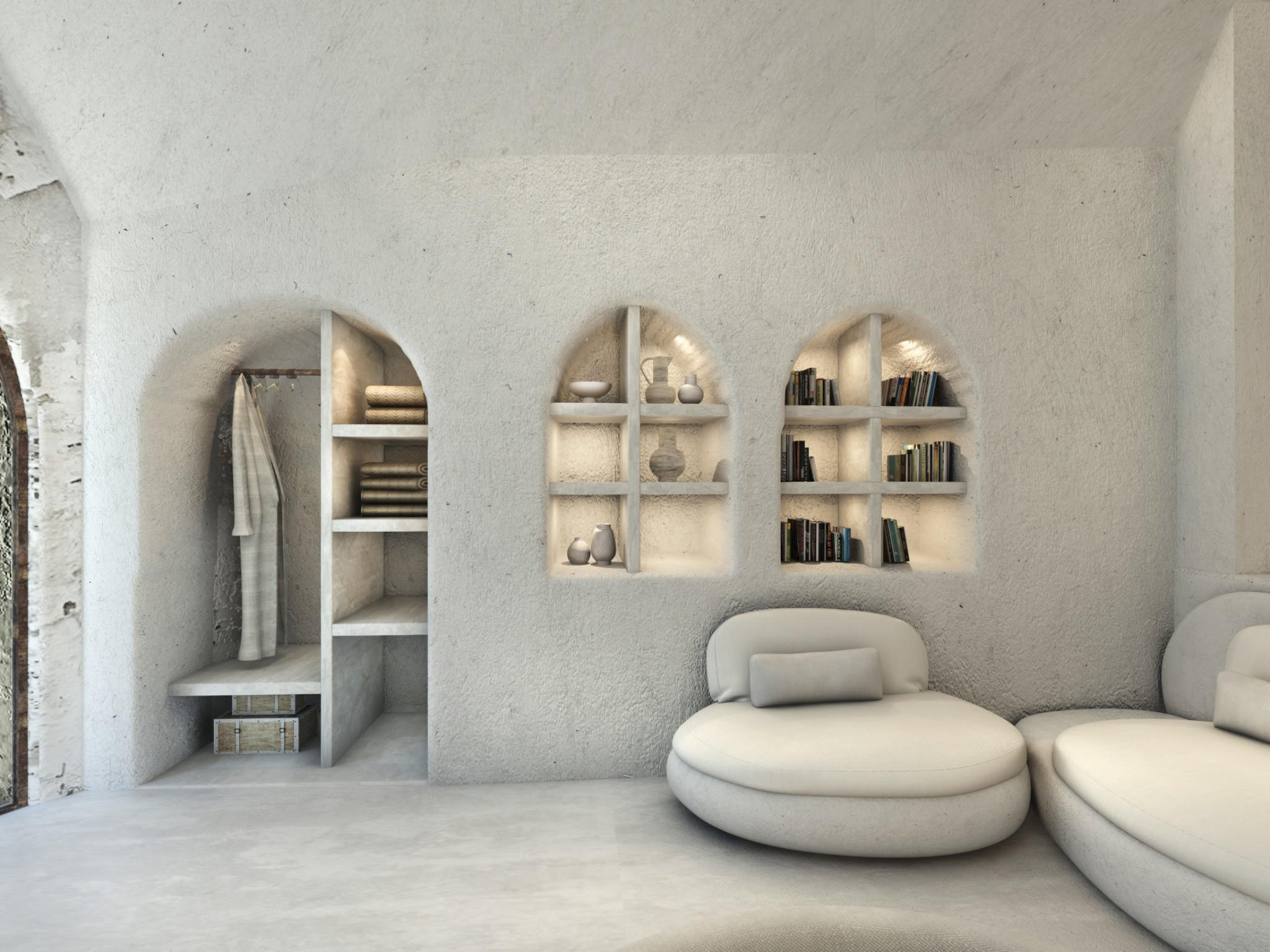 When the design team first visited this property, located in the traditional village of Karterados, on Santorini island, all that they found was two abandoned underground caves and two derelict buildings. The main design idea focused on highlighting every unique feature of the already existing structures, emphasising them and incorporating them in the design in an ergonomic and aesthetically pleasing manner. The project was separated into four sections: the design of the two underground spaces of different character, based on the few remaining elements and on the shape of the caves; the creation of a third apartment by unifying the two derelict overground structures; and finally the design of the exterior spaces. Initially, the entrance façades of the caves were designed, and then each and every element of their interiors were arranged and designed. After that, the team designed the two overground structures. Finally, they focused on the design of the yard and the external entrance to this complex from the traditional village.