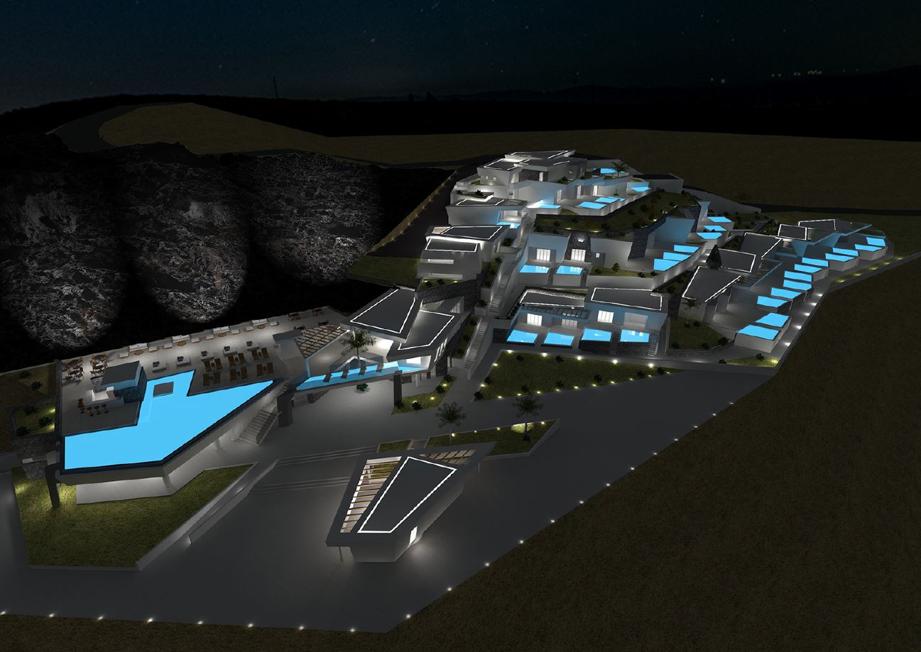 Με δεδομένα τα παραπάνω, δημιουργείται ένα ξενοδοχειακό συγκρότημα που ορίζεται από πρισματικούς όγκους, οι οποίοι αναπτύσσονται παράλληλα στις υψομετρικές καμπύλες, σε βαθμιδωτά επίπεδα, με αποτέλεσμα η κάθε σειρά διαμερισμάτων να έχει θέα και στην κάτωθεν σειρά. Για τον λόγο αυτό, δίνεται μεγάλη έμφαση στα δώματα του κτίσματος, τόσο όσον αφορά τη μορφολογία τους όσο και τον νυχτερινό φωτισμό τους.