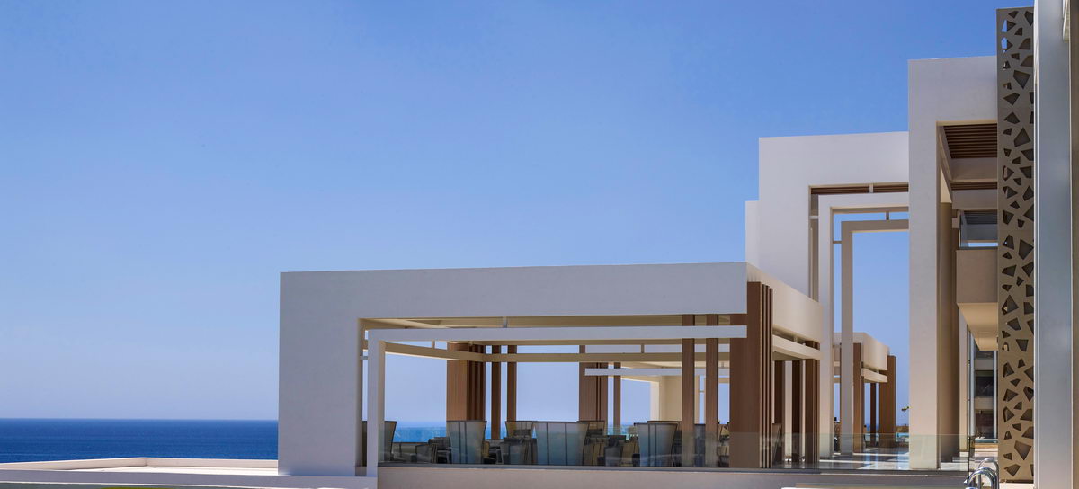 Στην περιοχή του μπαρ, που πλαισιώνεται με ένα υδάτινο στοιχείο και του εστιατορίου πλησίον της θάλασσας, δεσπόζουν δύο κελυφωτές πέργκολες. Εσωτερικά στο λόμπυ, θα απολαύσει ο επισκέπτης το παιχνίδι του φωτός και της σκιάς των διάτρητων στοιχείων, τις αυτοφερόμενες αψίδες που είναι η εξέλιξη των πυλών, τους τοίχους από χαλίκι και την έκρηξη φωτός στην οροφή. Πρόκειται για έναν χώρο μαγευτικό, σε συνδυασμό με την άπλετη θέα του γαλάζιου.