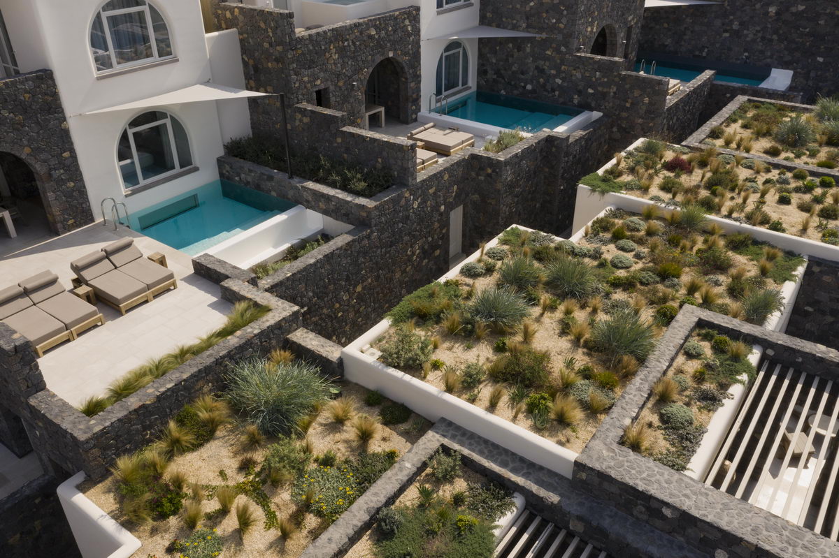 Στην παλέτα των υλικών κυριαρχεί η βαριά, μαύρη, τοπική πέτρα Σαντορίνης. Οι πέτρινες κατασκευές αναμειγνύονται με τον βράχο του γύρω τοπίου, τοποθετώντας άψογα το ξενοδοχείο στο περιβάλλον. Αυτή η αίσθηση συνοχής ενισχύεται με την προσθήκη παλαιών ελαιόδεντρων και μεγάλων, στρατηγικά τοποθετημένων πετρωμάτων σε όλο το ξενοδοχείο, σε μία προσπάθεια εξωραϊσμού, σχεδιασμένη να ελαχιστοποιεί το ορατό αποτύπωμα των αρχικών κατασκευών σκυροδέματος.