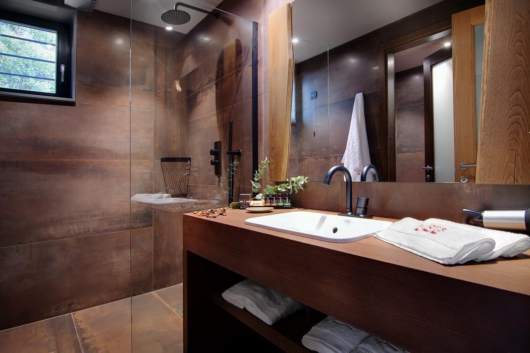 Στα κτίρια έχει κατασκευαστεί εξωτερική τοιχοποιία με πλακοειδείς πέτρες σε ελεύθερη δόμηση, η οποία συμπληρώνεται από φέροντα σκελετό και πλάκες οπλισμένου σκυροδέματος, επί οριζοντίων και κατακόρυφων δομικών στοιχείων. Στο ύψος των ποδιών και των πρεκιών των ανοιγμάτων, κατασκευάστηκαν φανερά διαζώματα από κοινό σκυρόδεμα. Έχει τοποθετηθεί ξύλινη στέγη με εμφανή εσωτερικά ζευκτά και η επικάλυψή της έγινε με σχιστολιθικές πέτρες. Παράλληλα, τοποθετήθηκαν ξύλινα εξωτερικά κουφώματα σύγχρονων προδιαγραφών. Οι στρώσεις δαπέδων έγιναν -κατά περίπτωση με πέτρα, μάρμαρο, κεραμικά πλακίδια και ξύλο, ανάλογα με τη λειτουργία του χώρου. Τέλος, έχουν κατασκευαστεί οι κατάλληλες ηλεκτρικές, μηχανολογικές και υδραυλικές εγκαταστάσεις, ψηφιακά συστήματα, ανελκυστήρες, συστήματα ασφαλείας, θέρμανσης, πυροπροστασίας και βιολογικού καθαρισμού, που απαιτούνται για τη σωστή λειτουργία του ξενοδοχείου.