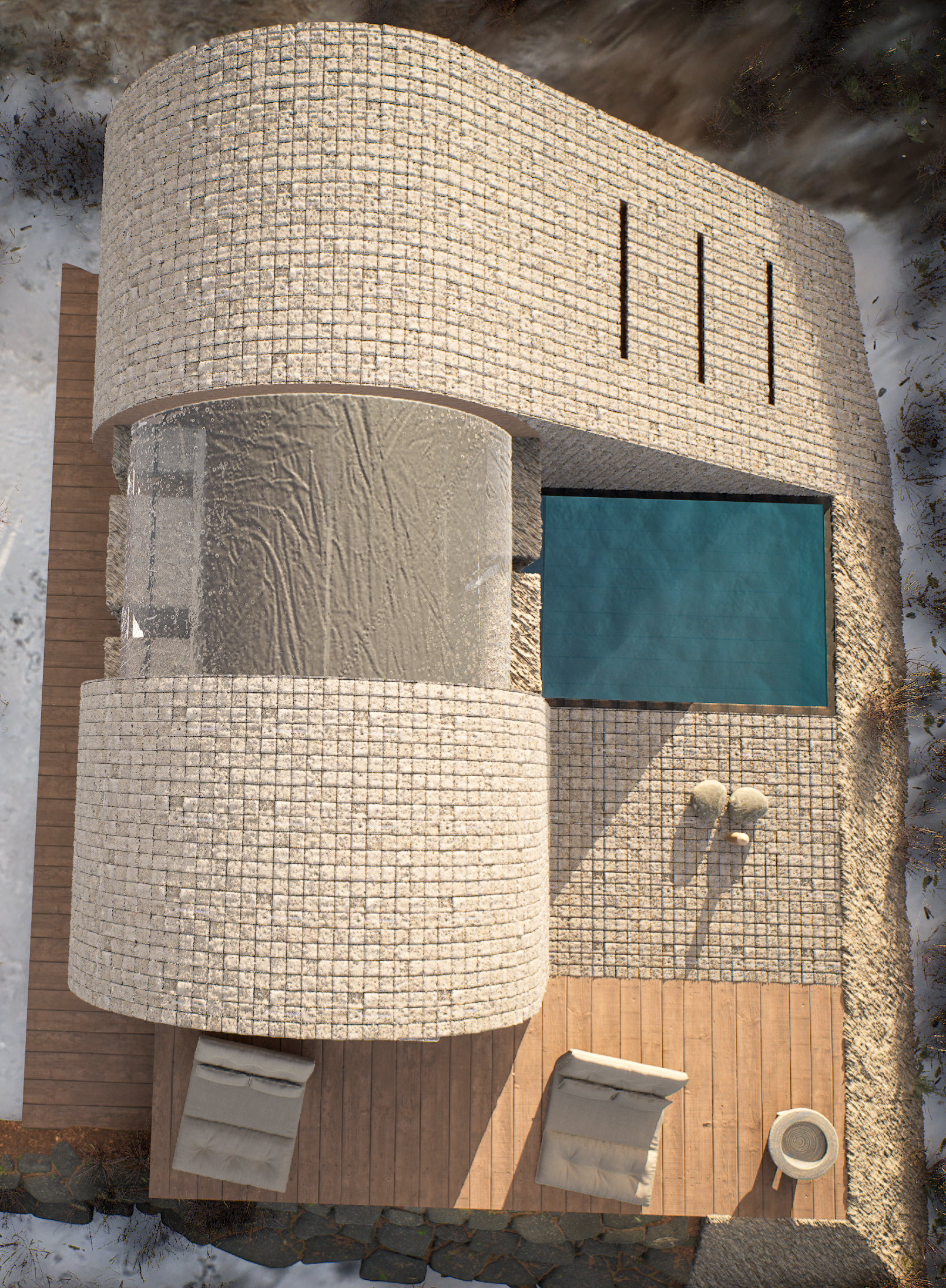 Έτσι λοιπόν, στο εν λόγω έργο χρησιμοποιούνται δύο ξύλινες κυλινδρικές επιφάνειες ως κέλυφος, με διάμετρο 3.5 μέτρα. Εξωτερικά επενδύονται με διακοσμητικό πλέγμα πωρόλιθου, και εσωτερικά με φελλό. Στον ενδιάμεσο χώρο που δημιουργείται μεταξύ των δυο κυλίνδρων, τοποθετούνται κάθετες επιφάνειες από αχυροπηλό ή αχυρόμπαλες, και στην οροφή αυτών μια θολωτή μεμβράνη από PVC. Το κρεβάτι τοποθετείται κάτω από αυτή τη μεμβράνη, έτσι ώστε ο ταξιδιώτης να μπορεί να απολαμβάνει τον ουρανό τις ώρες ανάπαυσής του. Επίσης, η ίδια μεμβράνη τοποθετείται και σε όλη την πρόσοψη του καταλύματος, αφήνοντας έτσι έναν ανοιχτό οπτικά διάλογο με το φυσικό περιβάλλον. Η όλη κατασκευή εδράζεται πάνω σε ξύλινη βάση, καθώς προβλέπεται και η τοποθέτηση εξωτερικού jakuzzi στην υπήνεμη πλευρά του καταλύματος. Τέλος, στον σχεδιασμό προβλέπεται ειδικός χώρος, όπου τοποθετείται η μηχανολογική υποστήριξη του καταλύματος καθώς και η δεξαμενή νερού. Ο χώρος μπορεί να είναι κλιματιζόμενος και παντελώς αυτόνομος, καθώς έχουν μελετηθεί όλα τα σενάρια ηλεκτροδότησης με γεννήτρια ή φωτοβολταϊκά πανέλα, καθώς και η ύδρευση αλλά και η αποχέτευση.