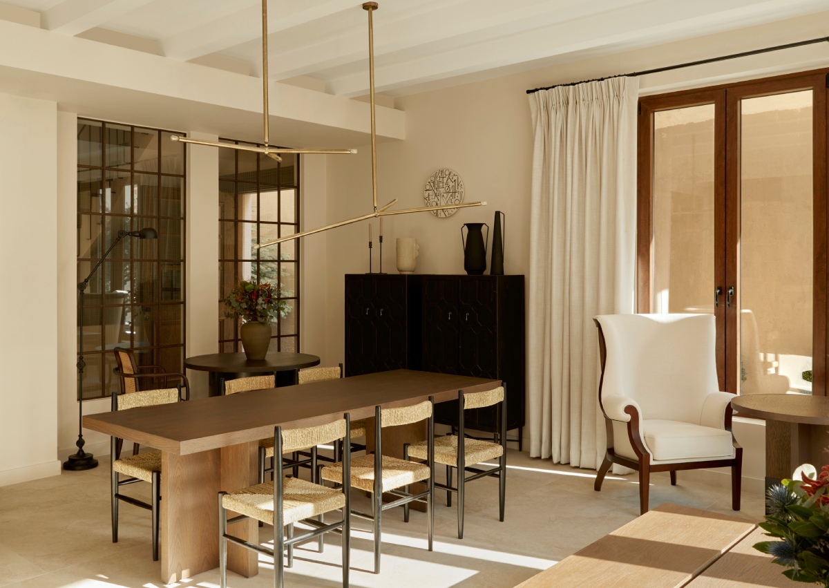 Στο συγκεκριμένο πρότζεκτ, η ομάδα των Babatchas Design Studio δανείστηκε στοιχεία από τη μοναστηριακή καθημερινότητα, όπως τα υλικά και τους χρωματικούς τόνους που κυριαρχούν στις μονές των Μετεώρων. «Σε αυτό το έργο στόχος μας ήταν να «δέσουμε» την εσωτερική αρχιτεκτονική με το τοπίο. Στη συνέχεια αναζητήσαμε την ουσία της τοπικής μοναστηριακής αισθητικής και την εντοπίσαμε στη μορφολογική ισορροπία ανάμεσα στο απλό και στο αυστηρό, μεταξύ βυζαντινού πλούτου και ασκητικής λιτότητας», αναφέρει η σχεδιαστική ομάδα. Τα δωμάτια ντύνουν τα λινά, πετροπλυμένα βαμβακερά υφάσματα και τα μαξιλάρια από τάπητες, ενώ οι δρύινες βουρτσιστές επιφάνειες και τα μάρμαρα Perla και Boticcino κυριαρχούν στους χώρους.