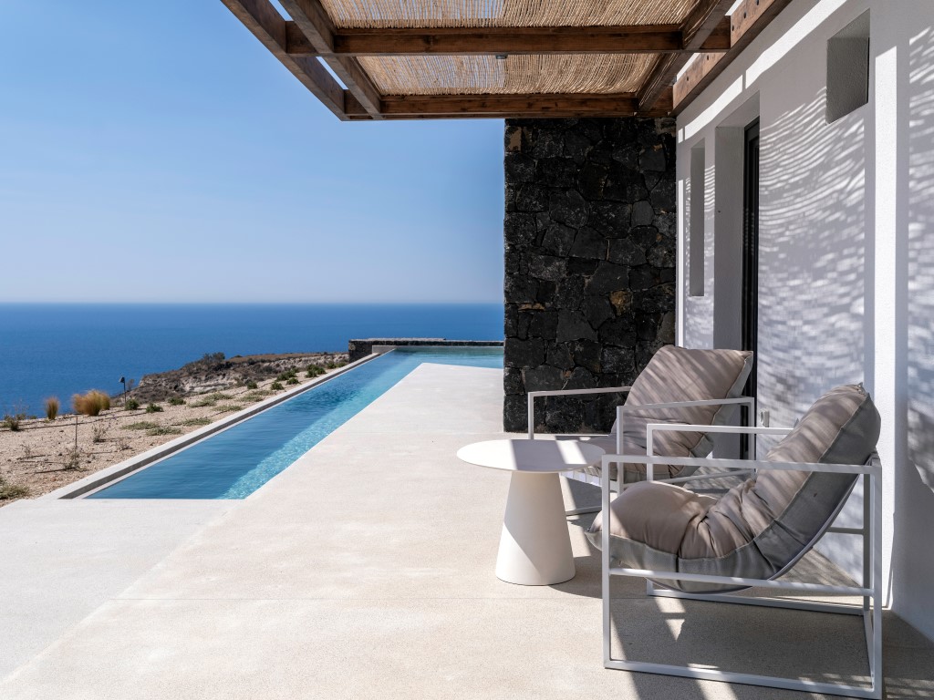 Οι KKMK Architects μετέτρεψαν μια κατασκευή του 2000 στη Σαντορίνη με προβληματική δομή και οργάνωση, σε ένα έργο βίλας που μοιάζει να έχει γεννηθεί από το ίδιο το νησί. Το όραμά τους βασίζεται σε αντιθέσεις –το ηφαιστειακό μαύρο και το κυκλαδίτικο λευκό, την αυστηρή γεωμετρία και τη φυσική ροή–, αντλώντας έμπνευση από τα ακατέργαστα υλικά της γης και το μυθικό παρελθόν του νησιού.