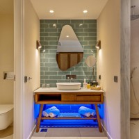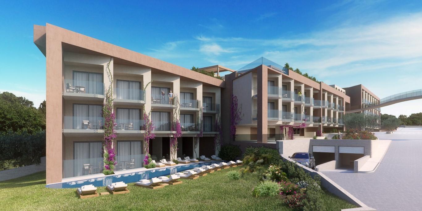 Αποτελείται από τρεις κτηριακούς όγκους, διαμορφωμένους σε διαφορετικά επίπεδα λόγω της κλίσης του εδάφους. Έχει συνολικά 51 δωμάτια. Ξεκινώντας απο τη βορεινή πλευρά (προς τη θάλασσα), ο πρώτος όγκος αποτελείται από τρεις ορόφους με 11 δωμάτια και στο δώμα βρίσκεται η πισίνα με τον αντίστοιχο χώρο για τις ξαπλώστρες. Η πισίνα έχει μήκος 17 μέτρα, η βορεινή της πλευρά εξέχει μερικώς του κτιρίου και έχει υαλοστάσιο, ώστε και μέσα στο νερό να έχεις απρόσκοπη θέα και μια αίσθηση ότι ενώνεσαι με τη θάλασσα στον ορίζοντα. Στο ισόγειο θα σχεδιαστεί ακόμα μια πισίνα, με άμεση πρόσβαση στον κήπο.