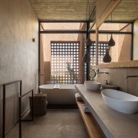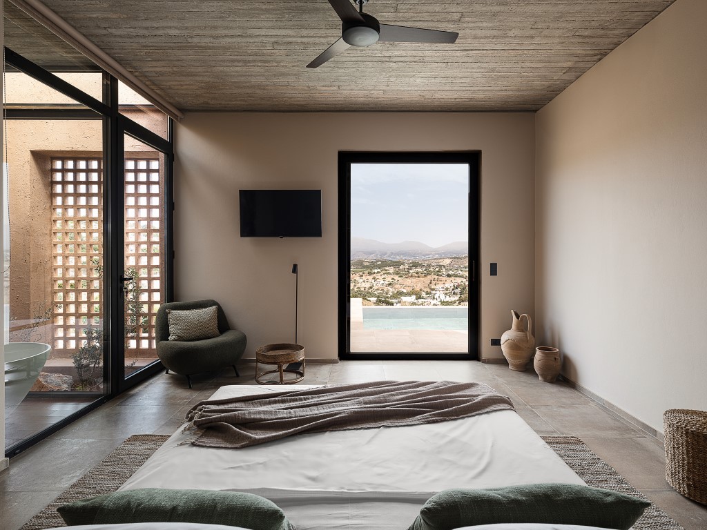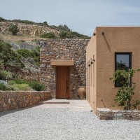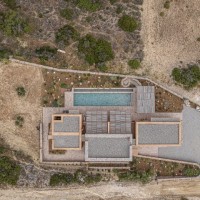 Τρεις καθαροί, διακριτοί όγκοι, ενωμένοι με διαφανείς γυάλινους λαιμούς, συγκροτούν την κατοικία, που, ενταγμένη στον λόφο με υλικά του τόπου, συνομιλεί με το τραχύ τοπίο της Νότιας Κρήτης.