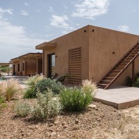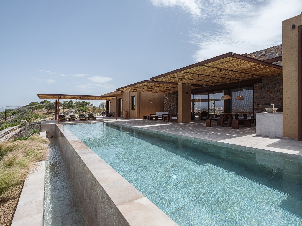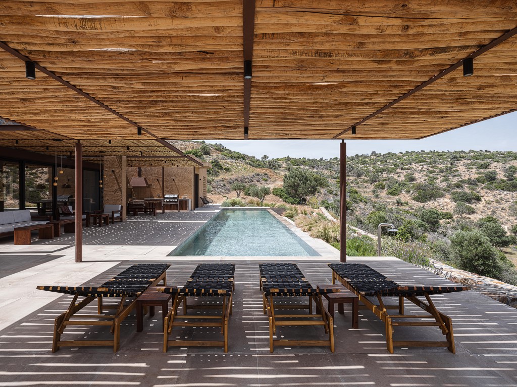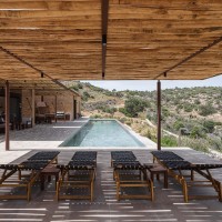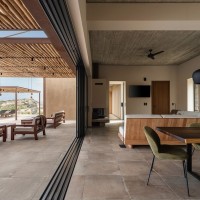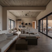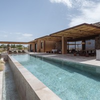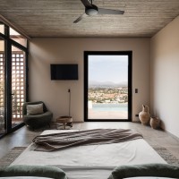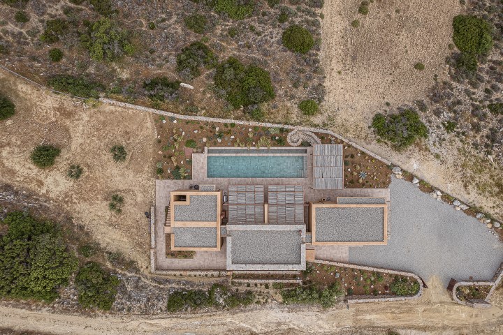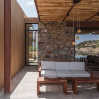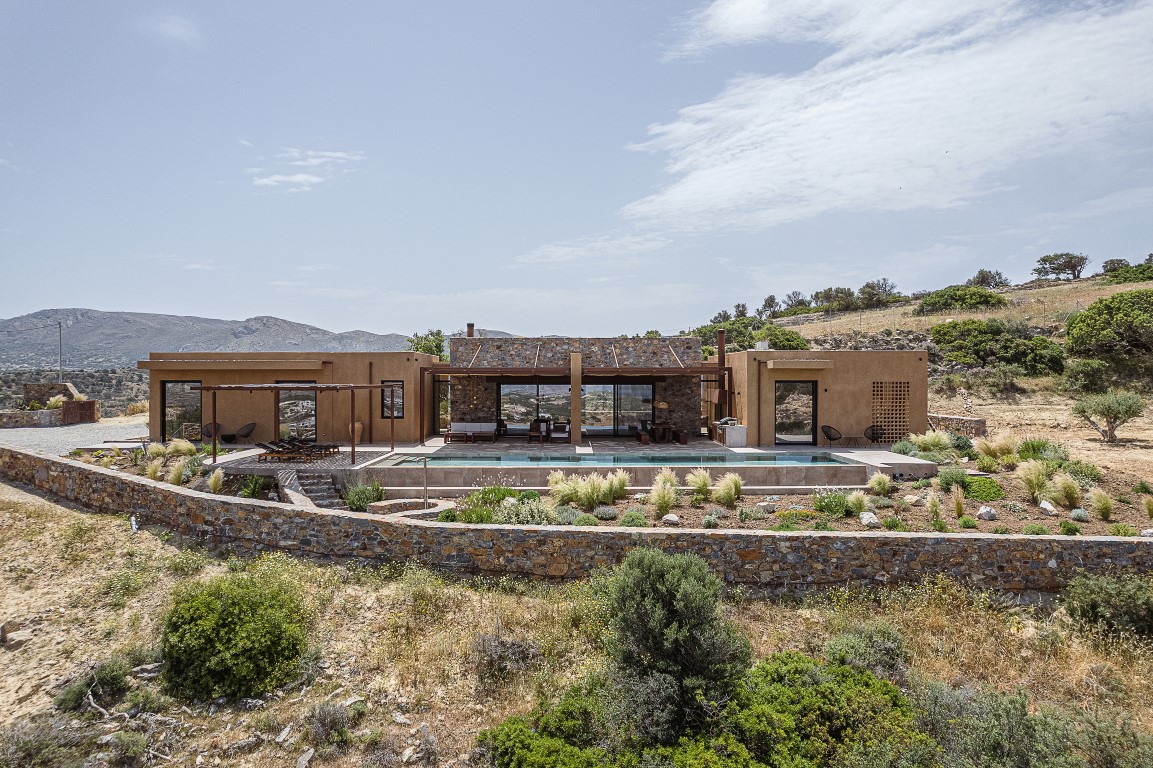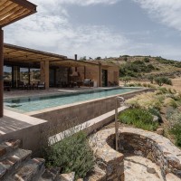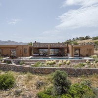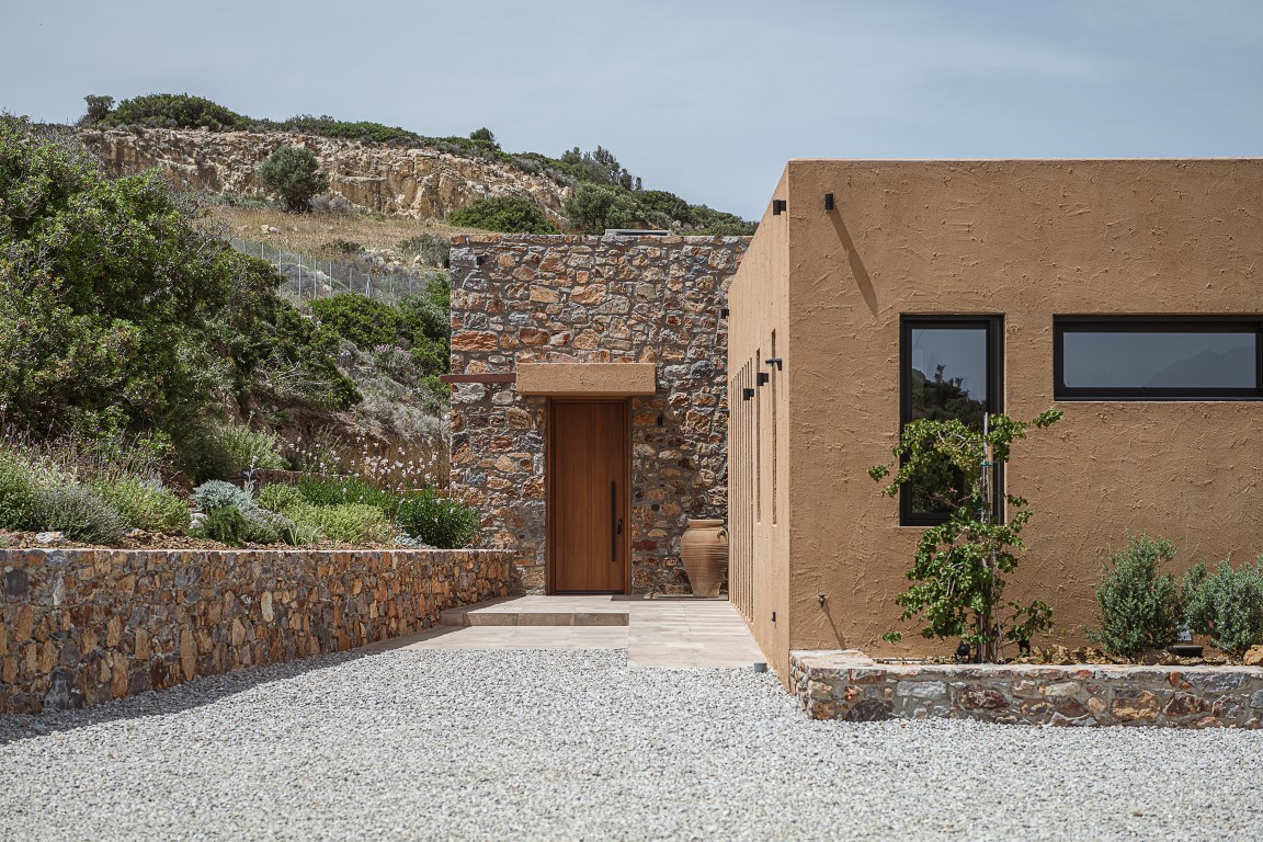 Η σύνθεση, απέριττη και γεωμετρική, έρχεται σε σιωπηλή αντιπαράθεση με τη διπλανή στάνη, αλλά και σε διακριτική συγγένεια, μέσα από την ειλικρίνεια των μορφών. Προστατευμένη από τον λόφο, ανοίγεται προς τη θέα του οικισμού, της θάλασσας και των βουνών. Μια αρχιτεκτονική που δεν επιβάλλεται στο τοπίο – ενσωματώνεται, αναπνέει και ανήκει.