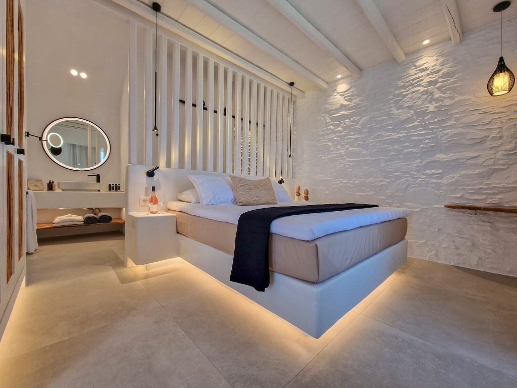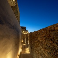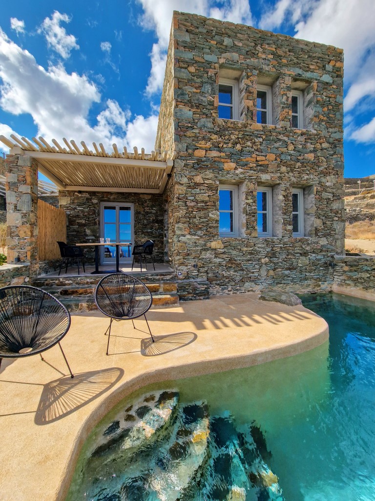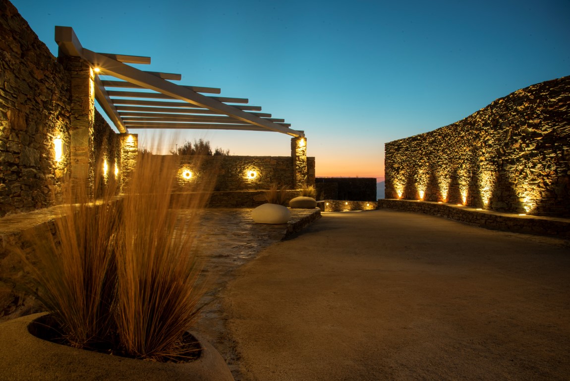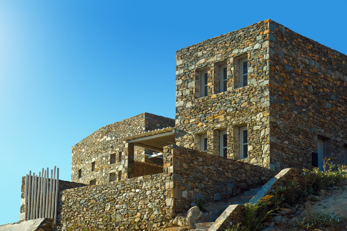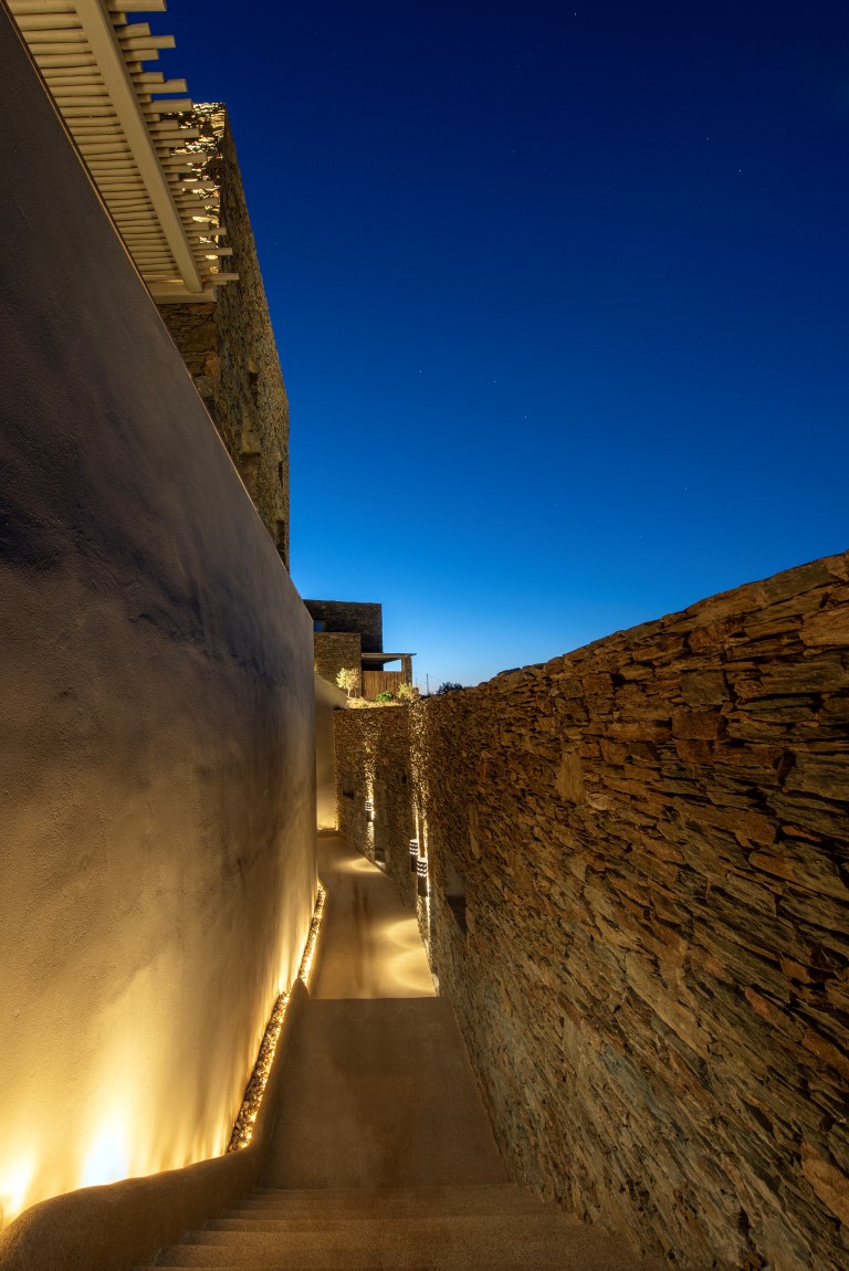 Έχοντας διατηρήσει το φυσικό ανάγλυφο του εδάφους, κατασκευάστηκαν υπόσκαφες κατοικίες στις θέσεις που η μορφολογία του λόφου υπέδειξε, αλλά και πέτρινες Βίλες που αγναντεύουν το Αιγαίο και τα γύρω νησιά των Κυκλάδων. Ο ιδιαίτερος βιοκλιματικός σχεδιασμός, σε συνδυασμό με τα φυτεμένα δώματα και τα ανοίγματα προς τις ευρύχωρες βεράντες με ιδιωτικές πισίνες από φυσικά βράχια και άμμο, εντάσσουν τους διαμένοντες στη φύση, ενώ απολαμβάνουν την ιδιωτικότητα της κατοικίας.