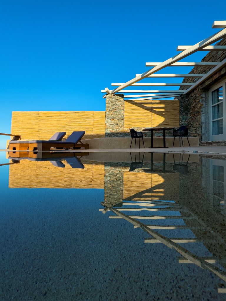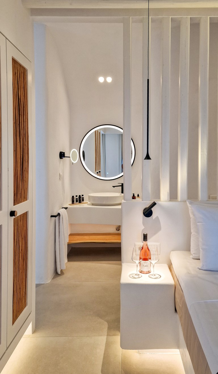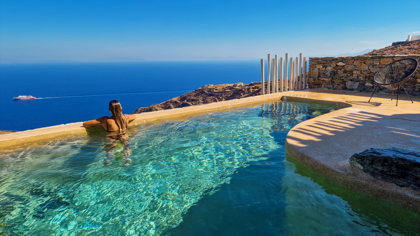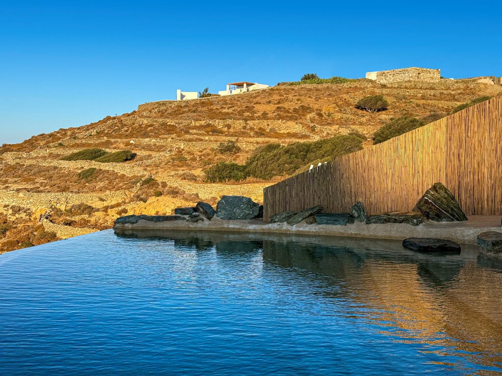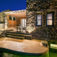 Έχοντας διατηρήσει το φυσικό ανάγλυφο του εδάφους, κατασκευάστηκαν υπόσκαφες κατοικίες στις θέσεις που η μορφολογία του λόφου υπέδειξε, αλλά και πέτρινες Βίλες που αγναντεύουν το Αιγαίο και τα γύρω νησιά των Κυκλάδων. Ο ιδιαίτερος βιοκλιματικός σχεδιασμός, σε συνδυασμό με τα φυτεμένα δώματα και τα ανοίγματα προς τις ευρύχωρες βεράντες με ιδιωτικές πισίνες από φυσικά βράχια και άμμο, εντάσσουν τους διαμένοντες στη φύση, ενώ απολαμβάνουν την ιδιωτικότητα της κατοικίας.