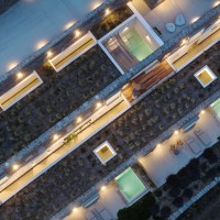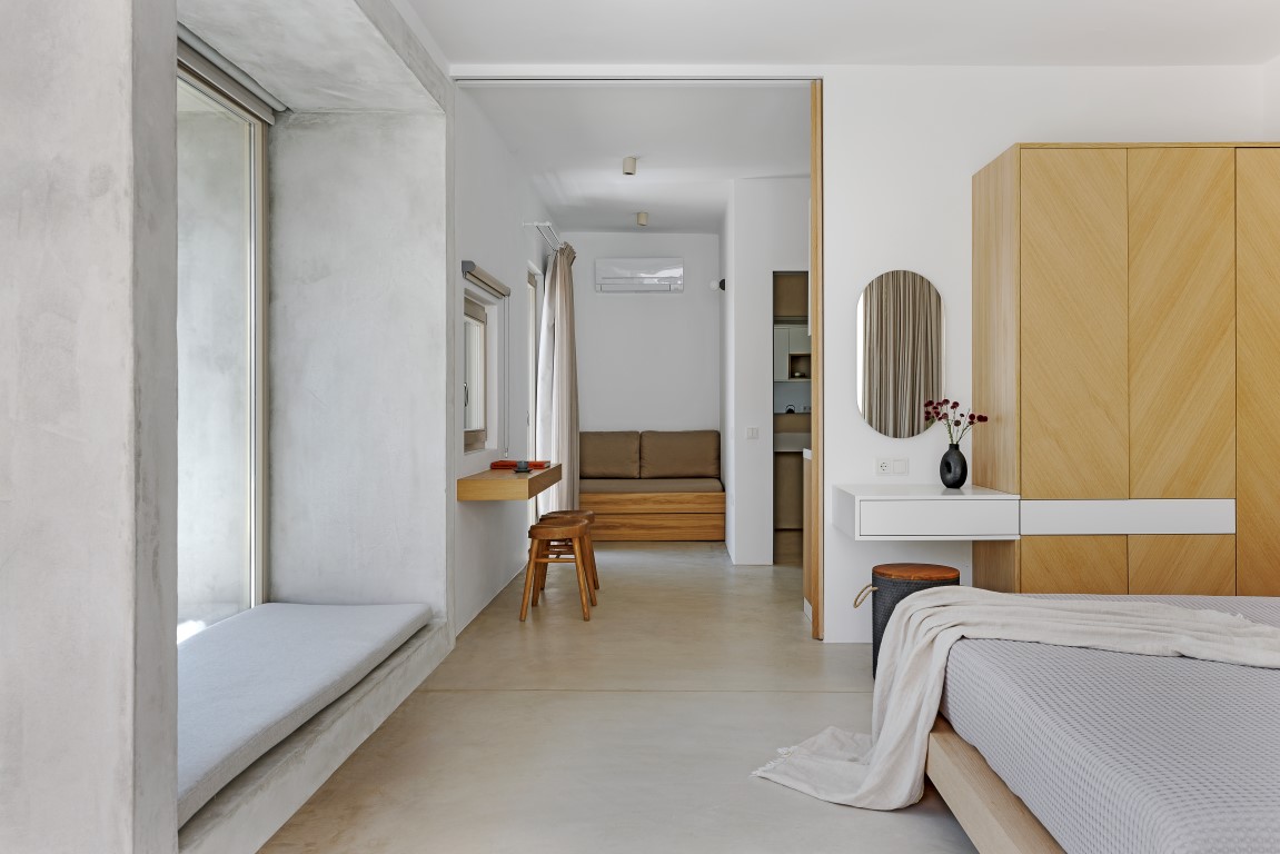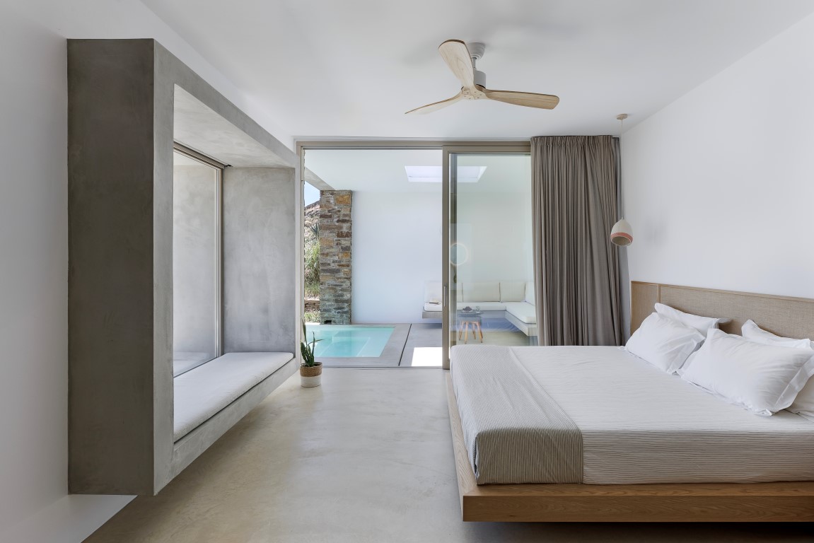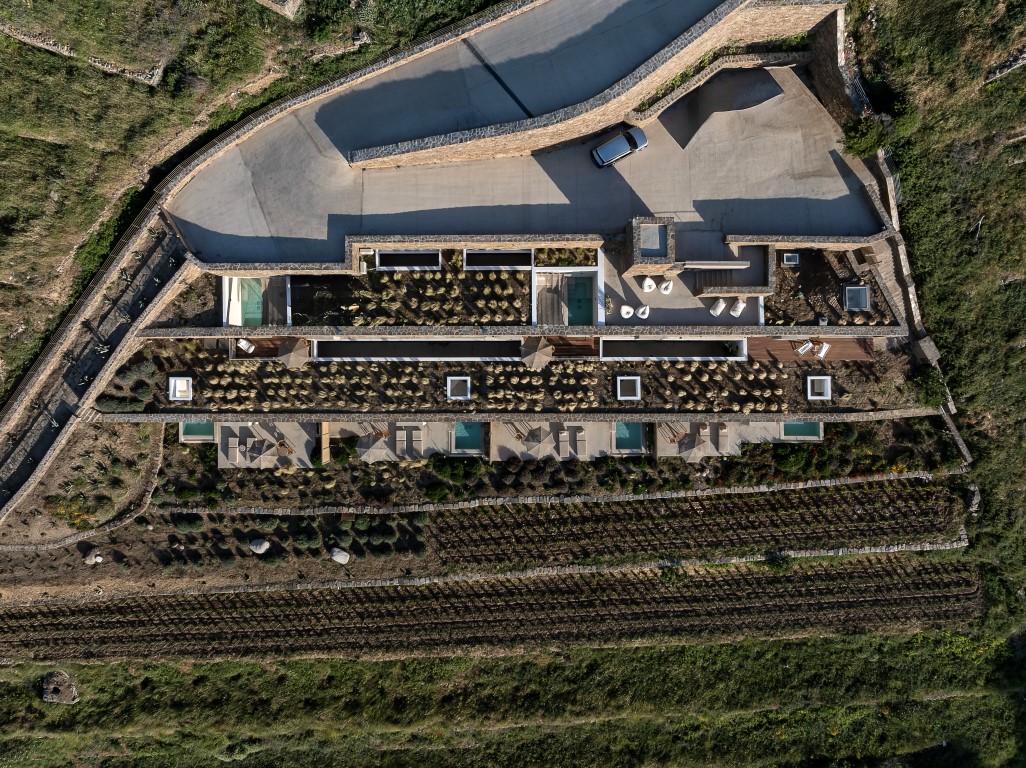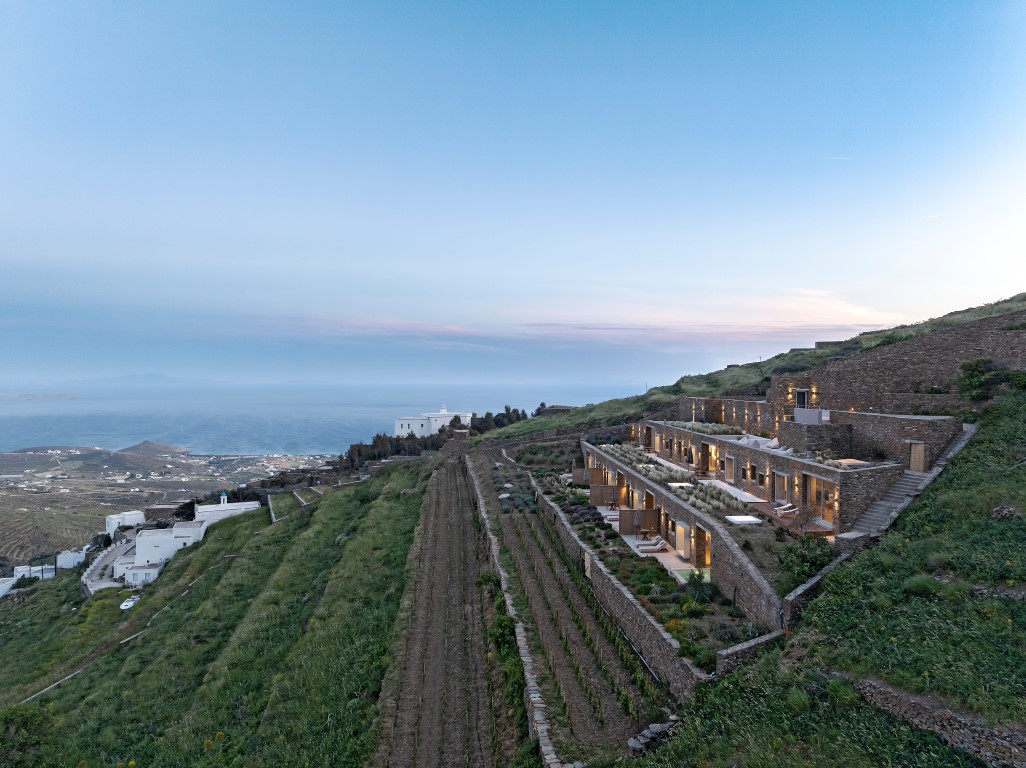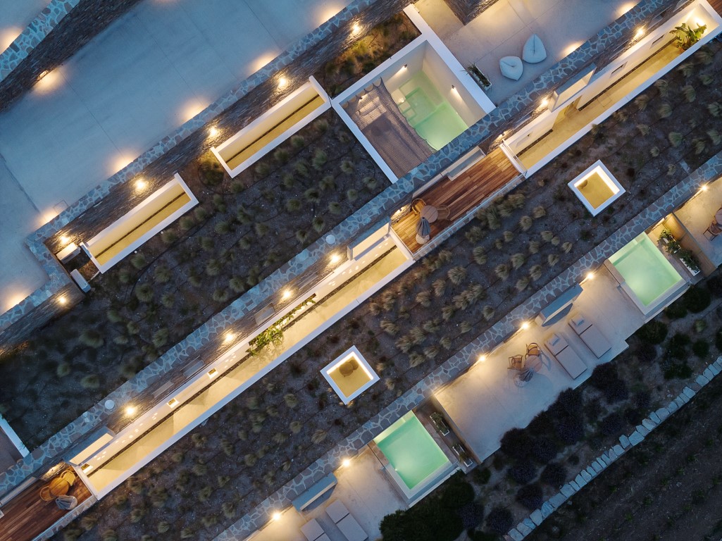 Το Ivy’s Natural Resort είναι ένα συγκρότημα έξι υπόσκαφων σουιτών, κτισμένο σε πλαγιά με έντονη κλίση στον Αρνάδο Τήνου. Σχεδιάστηκε με απόλυτο σεβασμό στο κυκλαδίτικο τοπίο. Οι ξερολιθιές ορίζουν τους χώρους, προσφέροντας προστασία, ιδιωτικότητα και απρόσκοπτη θέα προς τη θάλασσα, τη Δήλο και τη Μύκονο. Οι αυλές με ιδιωτικές πισίνες ενισχύουν τη λειτουργική αυτονομία και την αίσθηση ηρεμίας. Η αρχιτεκτονική ένταξη στο τοπίο επιτυγχάνεται με φυσικά υλικά, πατητή τσιμεντοκονία και τοπική πέτρα. Οι μινιμαλιστικοί, open-plan εσωτερικοί χώροι ενοποιούνται με το εξωτερικό περιβάλλον, προσφέροντας μια σύγχρονη, βιώσιμη και πολυτελή εμπειρία φιλοξενίας, απόλυτα συνδεδεμένη με τη νησιωτική φύση.
