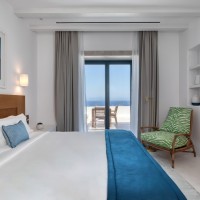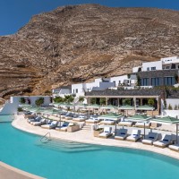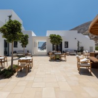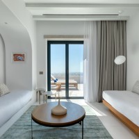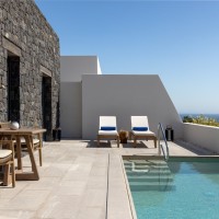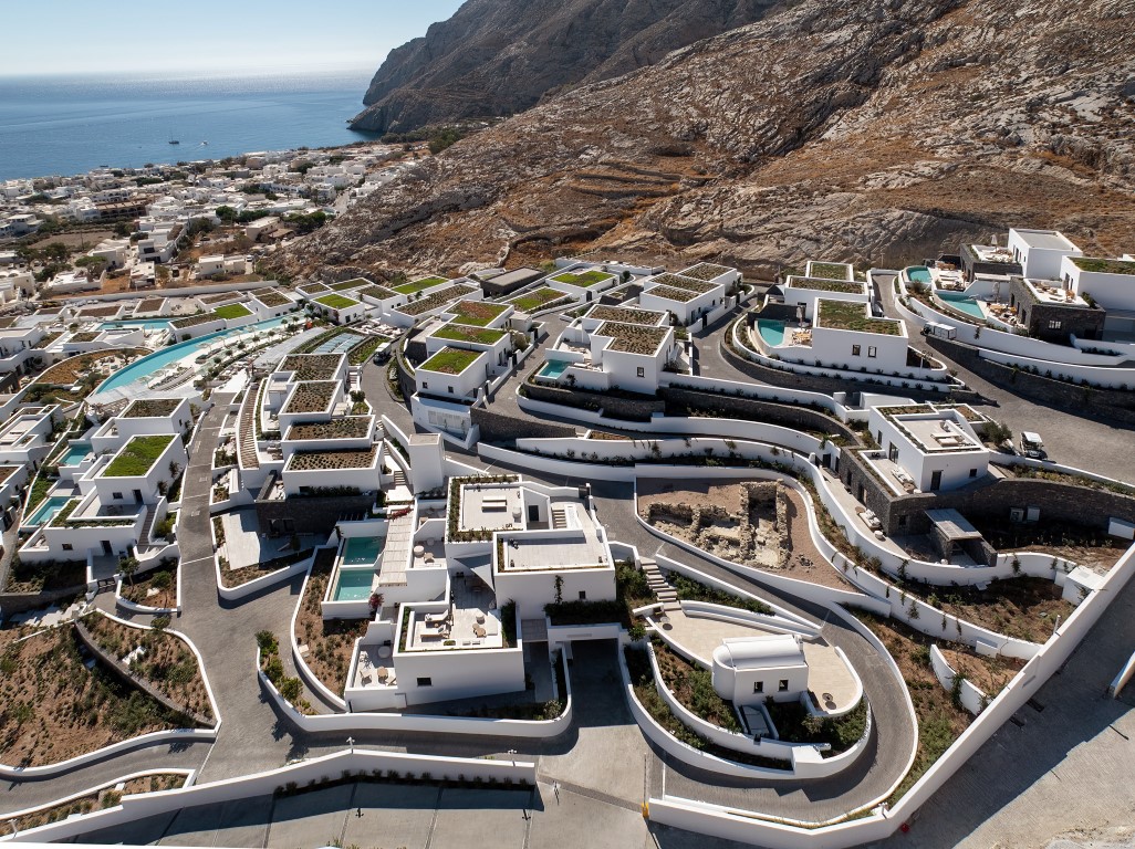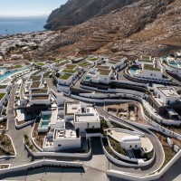 Το Sandblu Resort βρίσκεται στους πρόποδες της Αρχαίας Θήρας, με ανεμπόδιστη θέα στη θάλασσα. Το οικόπεδο χαρακτηρίζεται από τον επιβλητικό ορεινό όγκο στα δυτικά, το έντονο ανάγλυφο και τρία τοπόσημα: αρχαιολογικό χώρο στα βορειοδυτικά, παλαιό αλώνι στο κέντρο και υπόσκαφο στα νότια δίπλα στον βράχο. Οι κτιριακοί όγκοι, λιτά υπόλευκα πρίσματα, αναπτύσσονται αμφιθεατρικά, ακολουθώντας τους φυσικούς αναβαθμούς. Οι κοινόχρηστοι χώροι, στρατηγικά τοποθετημένοι, αξιοποιούν τα τοπόσημα και τη θέα στο Αιγαίο. Κατά την περιήγηση, ο επισκέπτης αποκτά συνεχώς νεες φυγές και ανακαλύπτει εκπλήξεις, τόσο σε κλειστούς όσο και σε υπαίθριους χώρους.