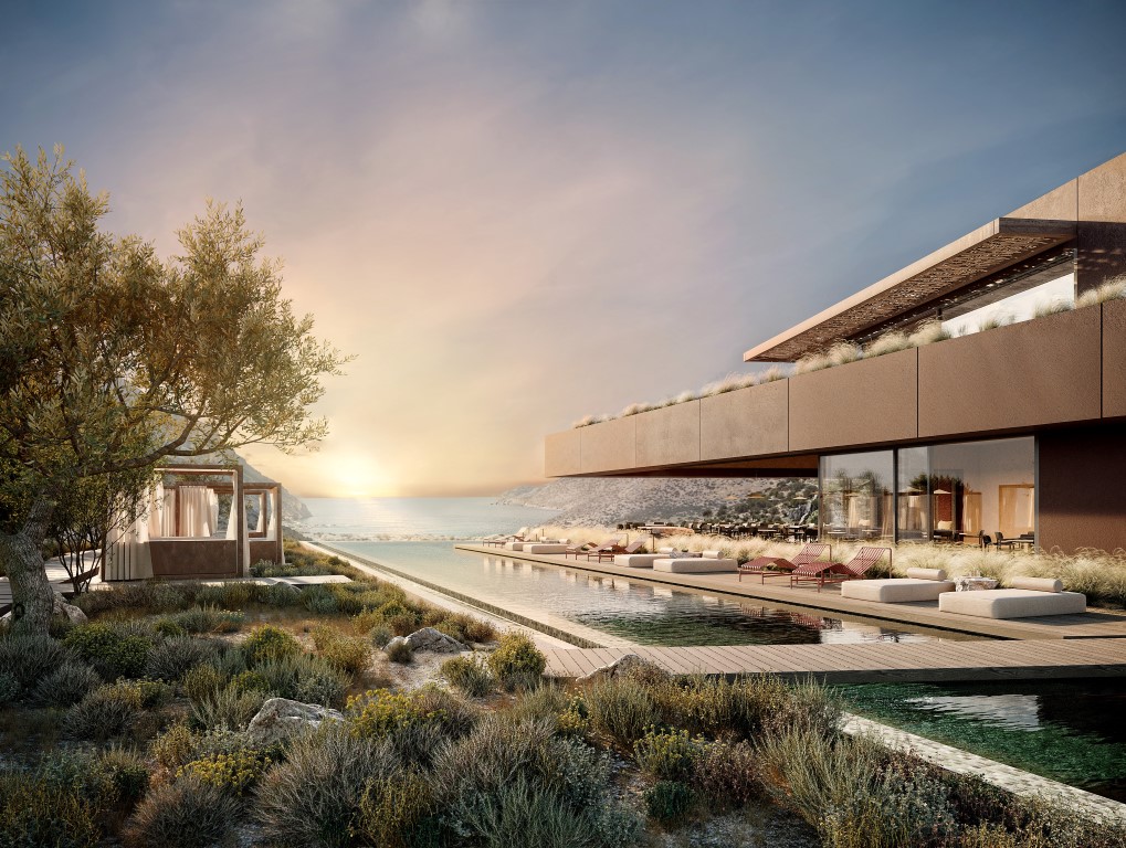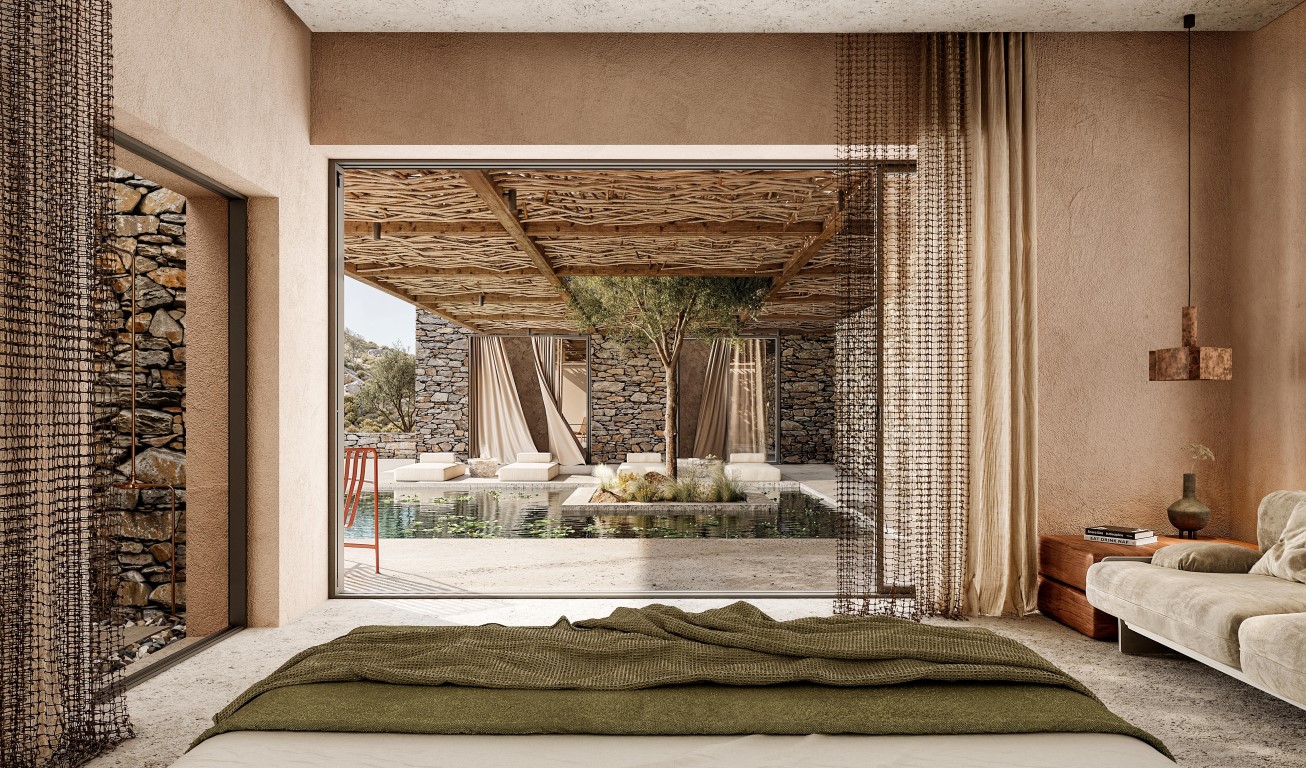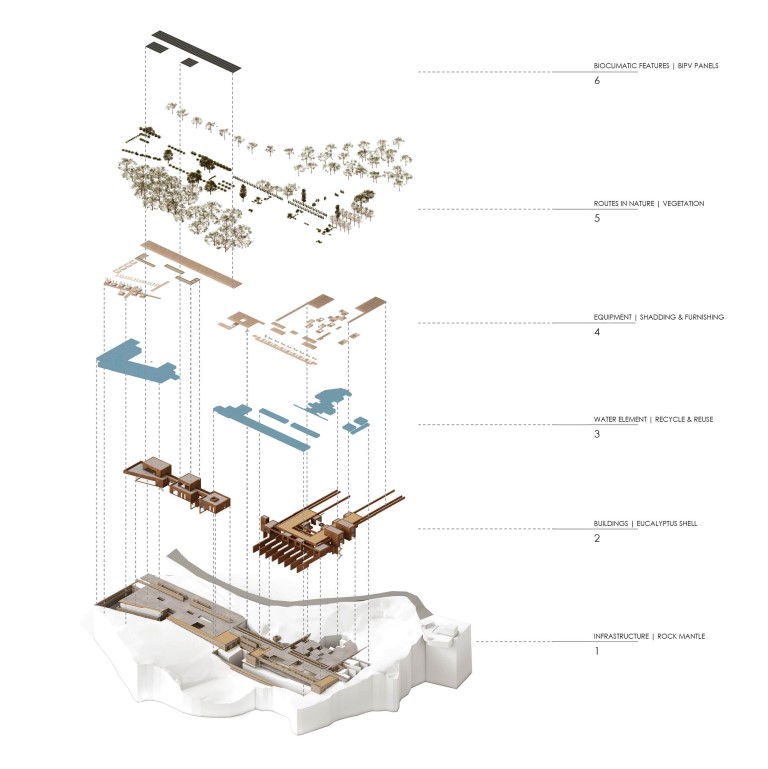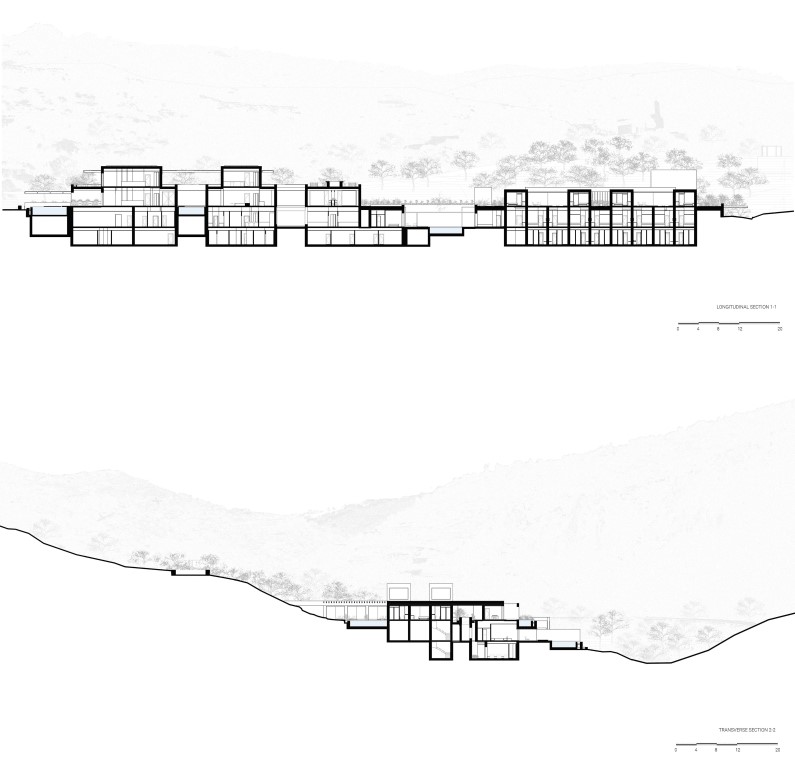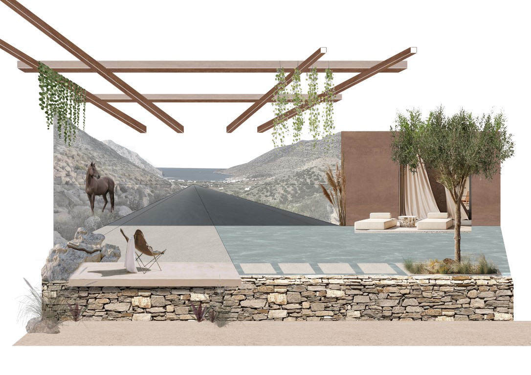 Πρωταρχική χειρονομία του σχεδιασμού του ξενοδοχείου 4 αστέρων Sifnos Mine επιφάνειας 2,600τ.μ. και δυναμικότητας 54 κλινών, είναι η χάραξη ενός επιμήκη άξονα Ανατολής–Δύσης, που ενισχύει τη θέα προς τις Καμάρες και το ηλιοβασίλεμα. Γραμμικά λιθόκτιστα τοιχία συγκροτούν τη βάση της σύνθεσης, εναρμονίζοντας την κατασκευή με το έντονο ανάγλυφο και αγκυρώνοντας τη σύνθεση στο έδαφος με ελάχιστο χωρικό αποτύπωμα. Οι λίθινες μάζες τέμνονται κάθετα από οριζόντιους άξονες κίνησης, που συνδέουν δημόσιες και ιδιωτικές λειτουργίες. Η λίθινη βάση (podium) σταδιακά αποδομείται, καθώς οι κάθετοι άξονες από πεπιεσμένο ευκάλυπτο λειτουργούν ως «ρήγματα» προς το φαράγγι, διαμορφώνοντας την εσωτερική όαση και το σύνολο των 25 δωμάτιων και αποδίδοντας τη μετάβαση από το στιβαρό στο ελαφρύ, σε διάλογο με το τοπίο και τα ορυχεία.
