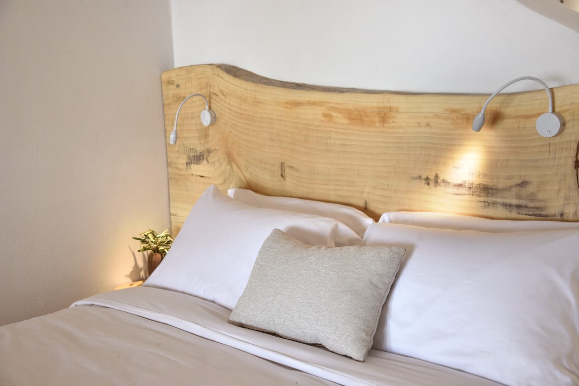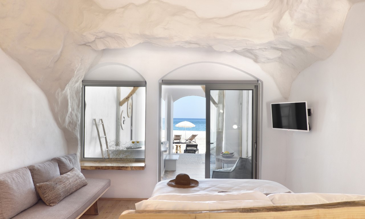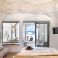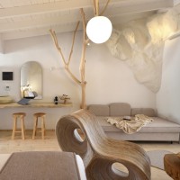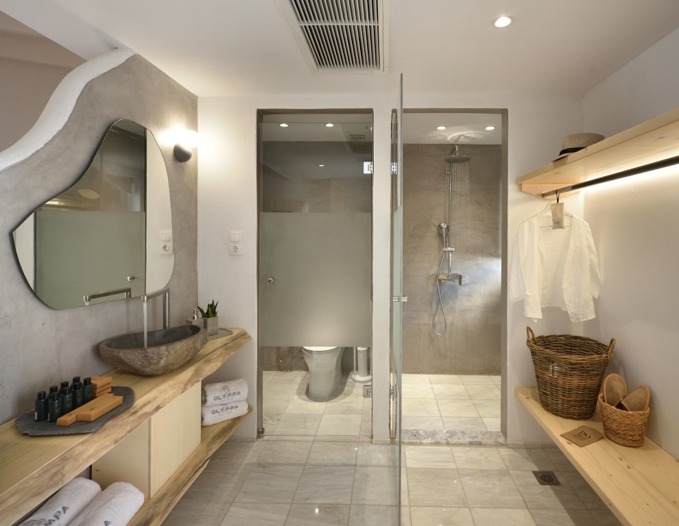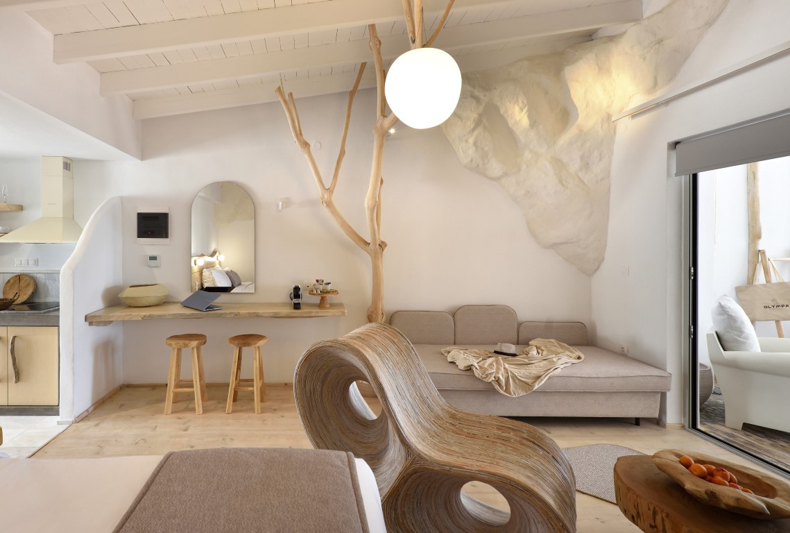 Η αίσθηση του καταφυγίου-σπηλιάς, με τα «cave style» rooms του Olympa Suites, ενός τόπου απόσυρσης από τις περιβαλλοντικές συνθήκες και αναστοχασμού, υπηρετεί αρμονικά τις αρχές του βιοφιλικού σχεδιασμού. Το σκηνικό συμπληρώνεται από τις «treehouse style» πινελιές των φυσικών δέντρων στο εσωτερικό των δωματίων. Η παρουσία των στοιχείων της φύσης στη διακόσμηση ενισχύουν την αποσύνδεση από τους έντονους ρυθμούς της καθημερινότητας.