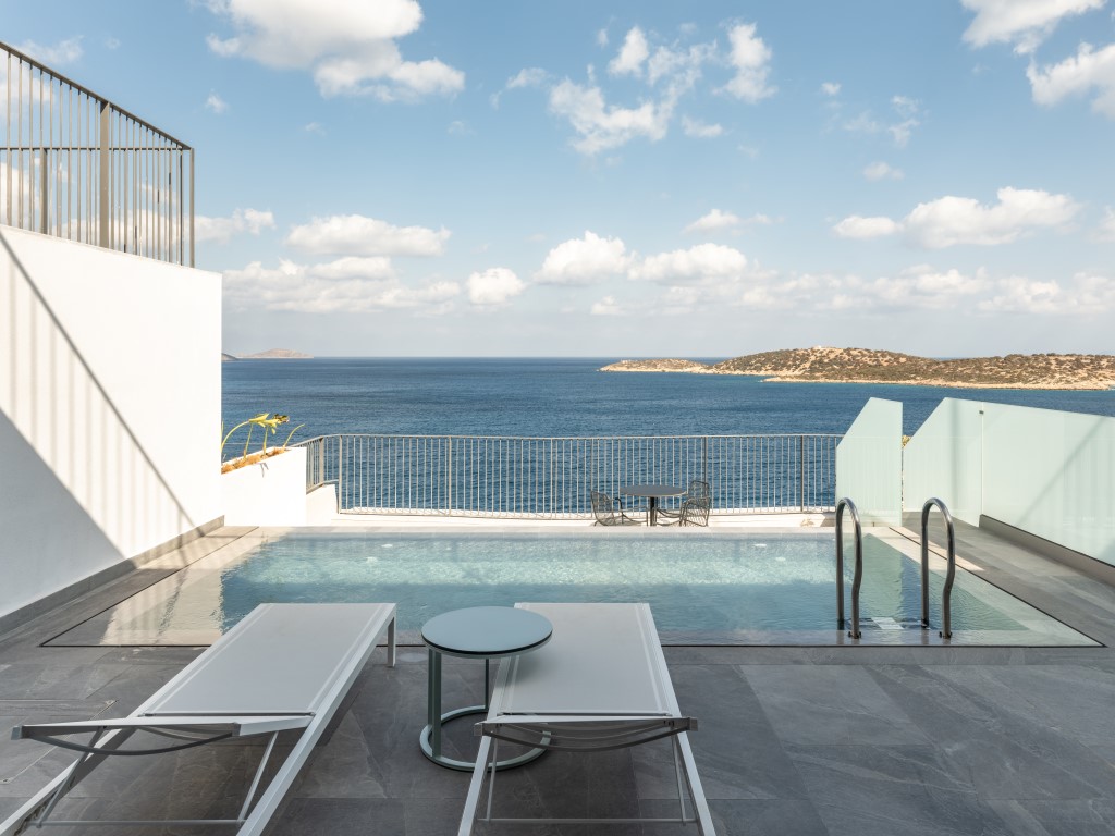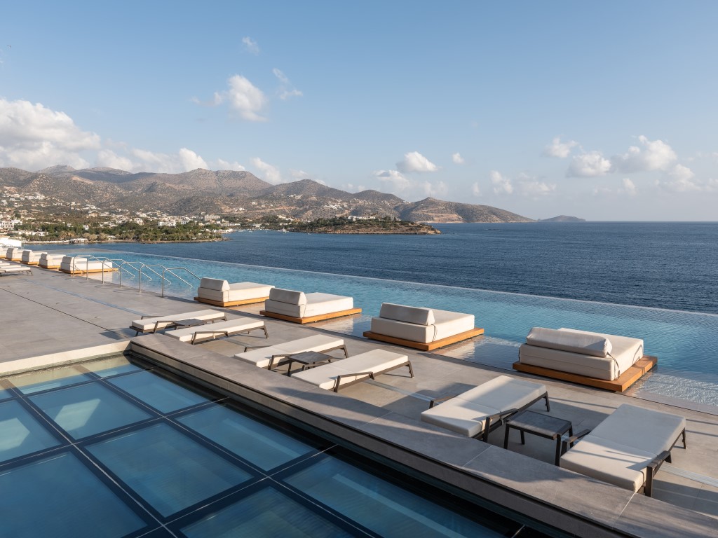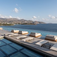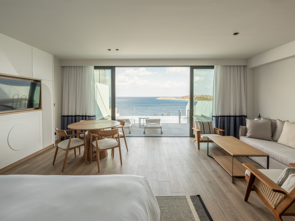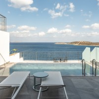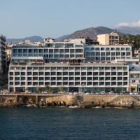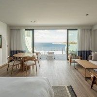 Τα δωμάτια (199) αναπτύχθηκαν με θέα στη θάλασσα, ενώ στο εσωτερικό, μέσα στον βράχο, χωροθετούνται το γυμναστήριο, το spa, οι βοηθητικοί χώροι.