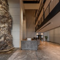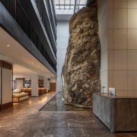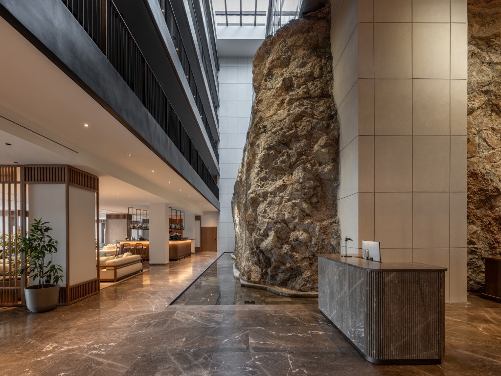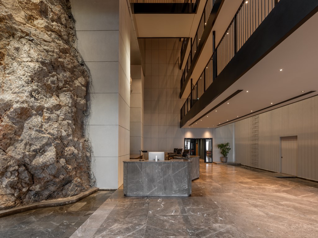 Εισερχόμενος σε αυτό, βιώνει μία ξεχωριστή εμπειρία καθώς από ένα πολύβουο περιβάλλον εισέρχεται σε ένα φωτεινό και ήσυχο περιβάλλον, ερχόμενος σε επαφή με θεμελιώδη γήινα στοιχεία, το νερό και τη γη οριζόμενα από το εσωτερικό αίθριο με τον κατακόρυφο βράχο και το νερό στο δάπεδο ως φυσική απόρροια και φυσικό φωτισμό από τα skylights. Η εμπειρία ενισχύεται από την «είσοδο» στον βράχο προς τους ανελκυστήρες, για την άνοδο στους ορόφους.