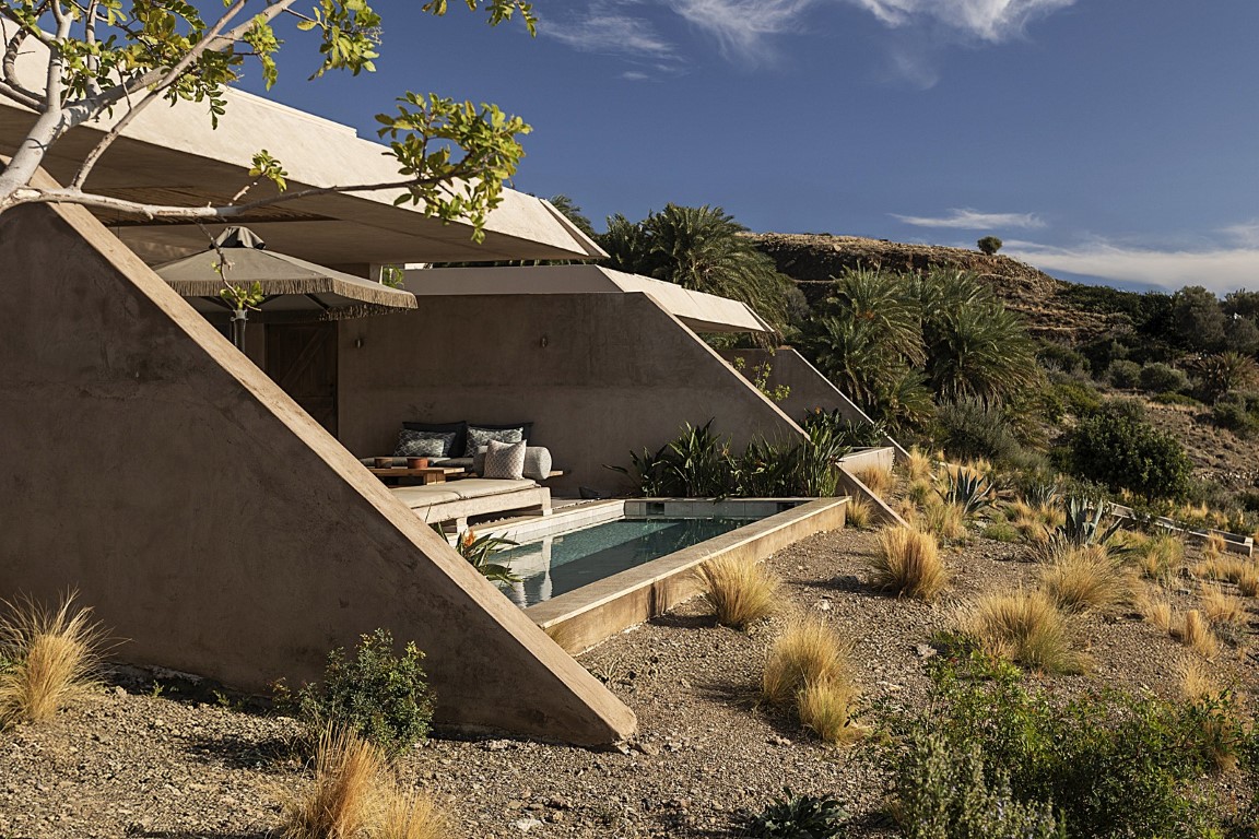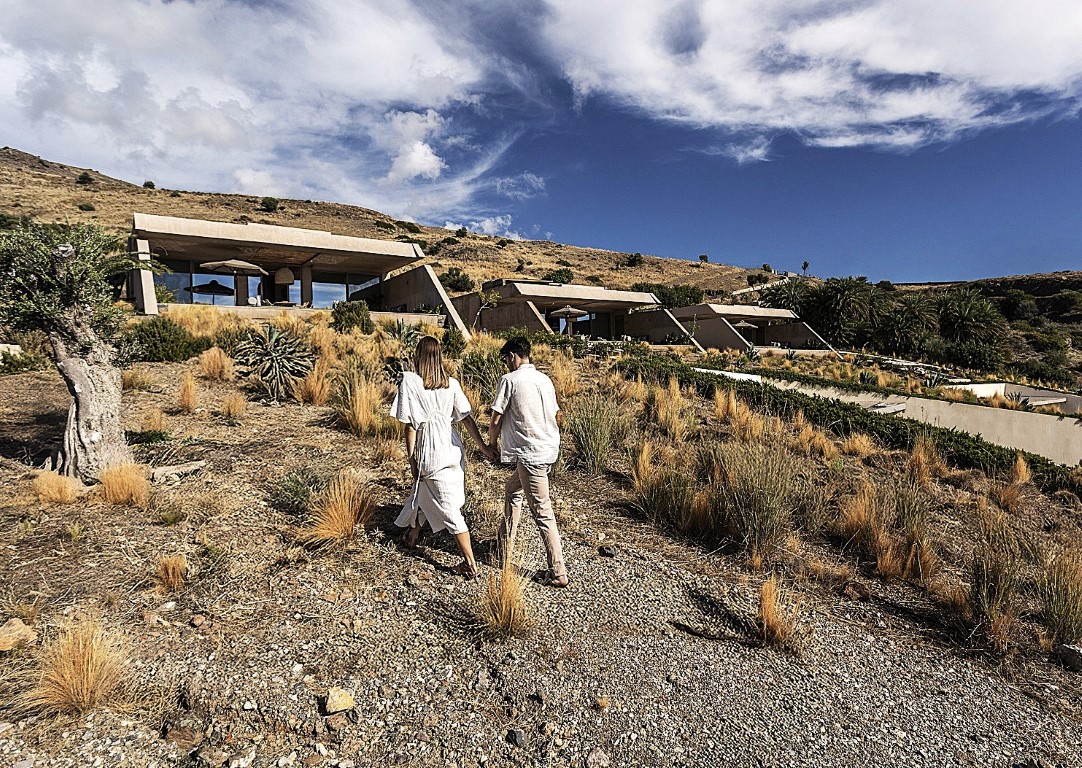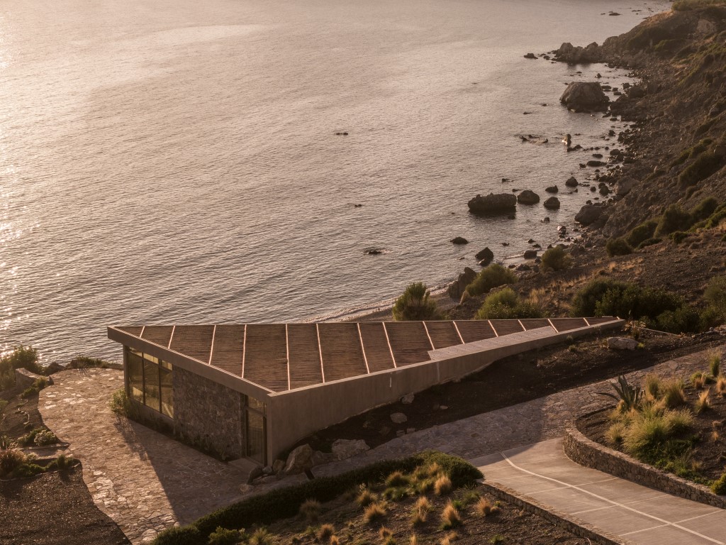 ενώ οι κύριοι χώροι ανοίγονται προς το Λιβυκό Πέλαγος. Κεκλιμένοι τοίχοι αντιστήριξης καθοδηγούν την κίνηση και εντείνουν τη σχέση με τη θέα.