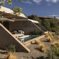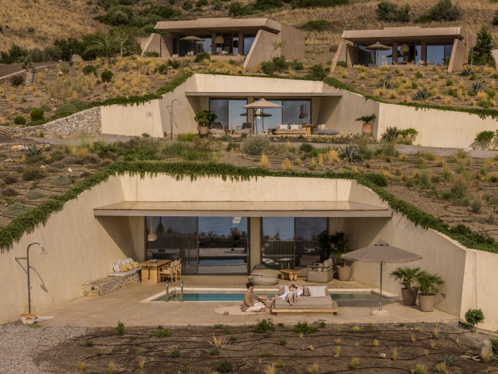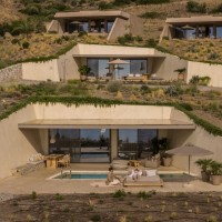 Τέσσερις υπόσκαφες κατοικίες ενσωματώνονται στην πλαγιά, επιτρέποντας στο φυσικό ανάγλυφο να «ρέει» πάνω από τους όγκους,