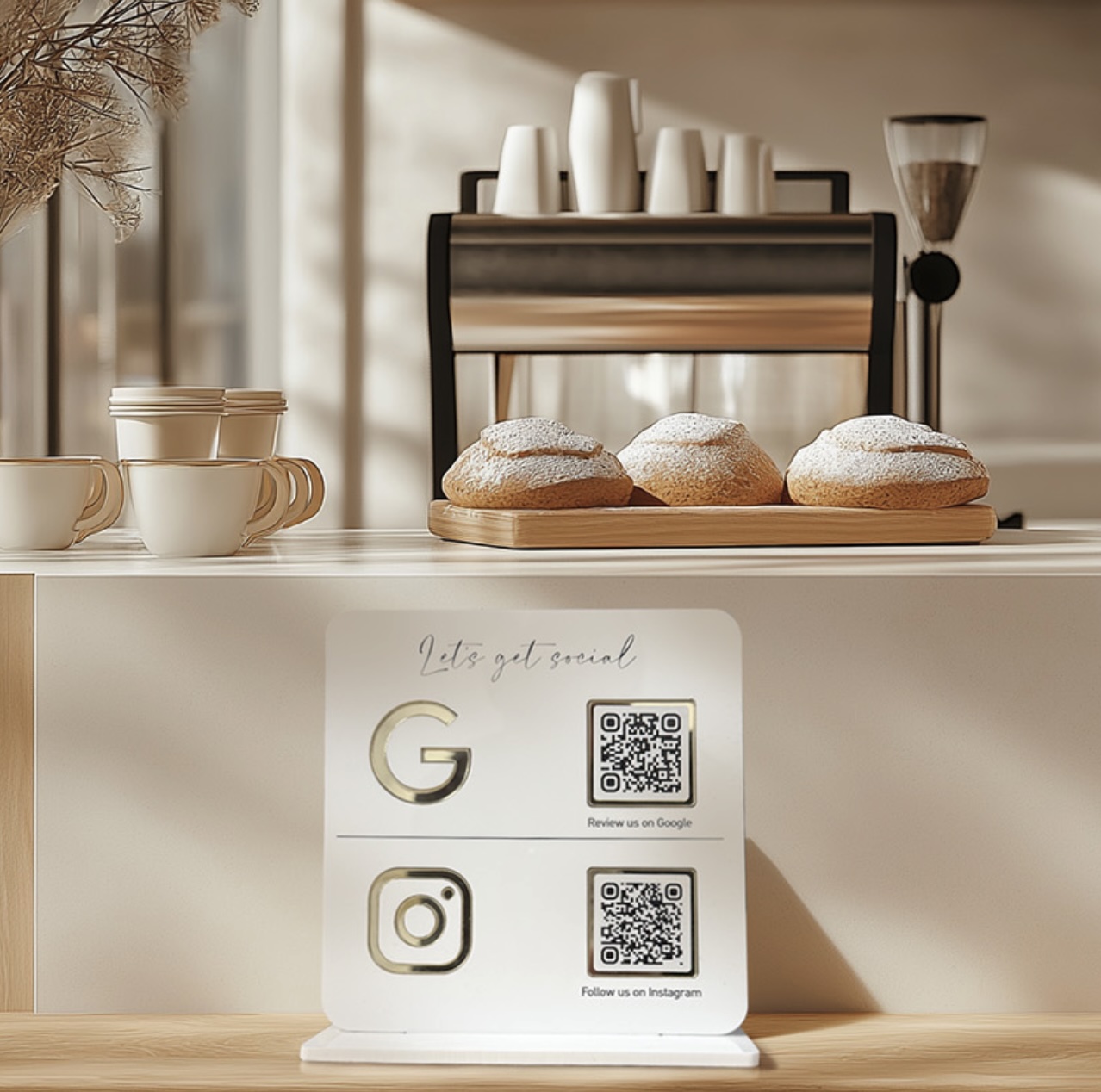 Σχεδιάζουμε και παράγουμε metal prints και καμβάδες για δωμάτια, lobby και κοινόχρηστους χώρους, καθώς και λειτουργικά ακρυλικά stands και QR ταμπελάκια για menu, room service, Wi-Fi, πληροφορίες και Google reviews.